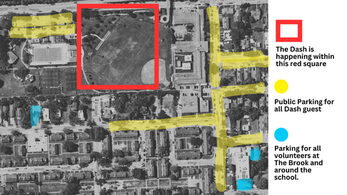 Please park at The Brook church so that we can save as much space as we can for our guest who are coming to The Dash. We will be towing people back and forth from this parking lot.